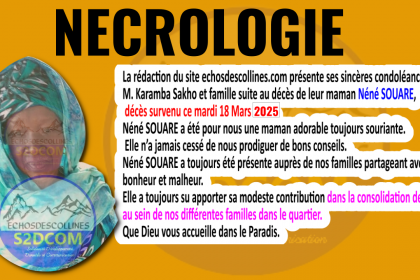 La rédaction du site echosdescollines.com présente ses sincères condoléances à M. Karamba Sakho et famille suite au décès de leur maman Néné SOUARE, décès survenu ce mardi 18 Mars 2025. Né...