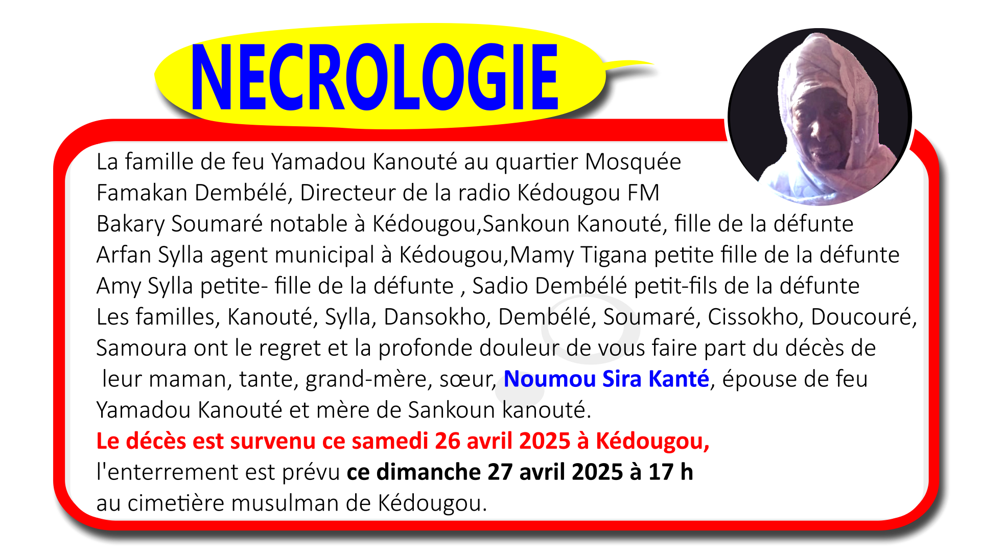 Home / SOCIETE / Décès de Noumou Sira Kanté…ACCUEILSOCIETEDécès de Noumou Sira Kanté…avril 27, 2025 Post Views: 1 007 Share this ArticlePrevious Article Kédougou : Sénégal-Guinée Conakry, des relations encore plus solides (Version Peulh)Next ArticleLe Ministre Moustapha Mamba Guirassy combat la fracture numérique diaby Related Posts Kédougou : Bilaly Bâ s’engage dans un projet agricole octobre 2, 2025 « Jub Jubal Jubbanti » en marche !!! octobre 1, 2025 Kédougou :Le ministère de l’énergie, du pétrole et des mine ... octobre 1, 2025 Leave a Reply Annuler la réponseVotre adresse e-mail ne sera pas publiée. Les champs obligatoires sont indiqués avec *CommentNom * E-mail * Site web Enregistrer mon nom, mon e-mail et mon site dans le navigateur pour mon prochain commentaire.